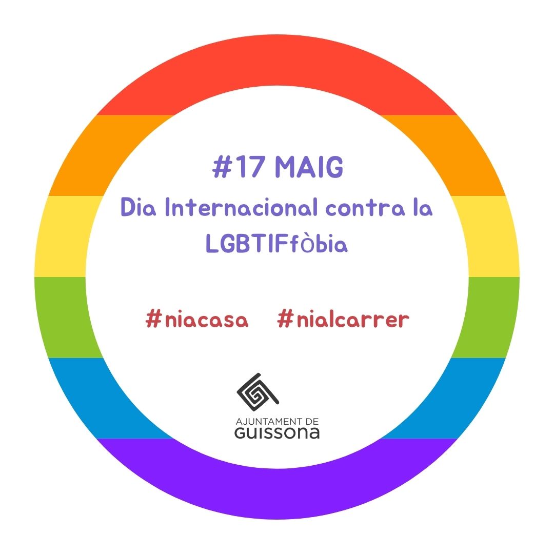 L’Ajuntament de Guissona s'adhereix a aquesta jornada i rebutja tota situació de discriminació, d'injustícia i de violència envers les persones per llur identitat de gènere o llurs orientacions sexuals i afectives. Condemnem les actituds de rebuig, de prejudici i d'hostilitat, i reivindiquem que puguin viure amb llibertat, sense discriminació ni cap tipus de violència per raó d’orientació sexual, identitat o expressió de gènere.
