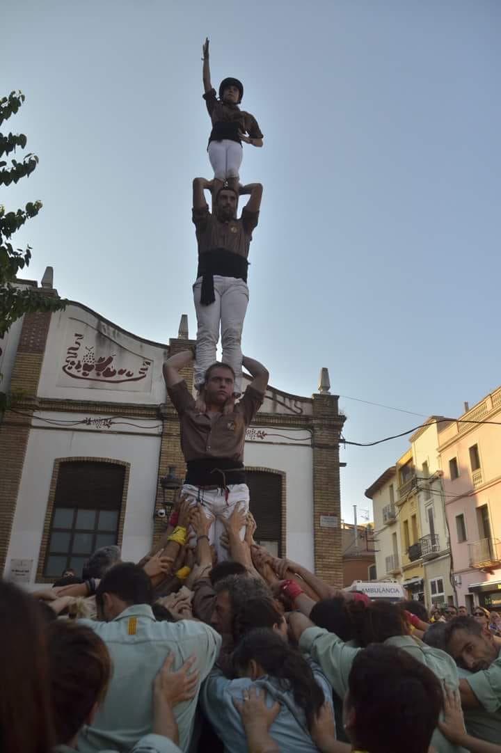 La primera colla en actuar va ser la colla local. Amb potser menys camises de les esperades per ser la seva Festa Major, i pel fet de ser només dues colles a plaça, van decidir aparcar els castells de 7 (que aquest any ja han sovintejat amb força regularitat havent descarregat set vegades el 3d7 i quatre vegades el 3d7) i van optar per una actuació tranquil·la amb castells de 6. Van obrir plaça amb un plàcid 3d6a, castell que no els va suposar cap problema i que segurament intentaran alçar un pis d’aquí a finals de temporada. En segona ronda es van decantar per la torre de 6, castell que tampoc els va suposar cap dificultat per descarregar-lo (era la cinquena d’aquesta temporada, totes descarregades). Per tancar la seva actuació van apostar per un 4d6 que de ben segur aviat tornarem a veure amb un pis més.