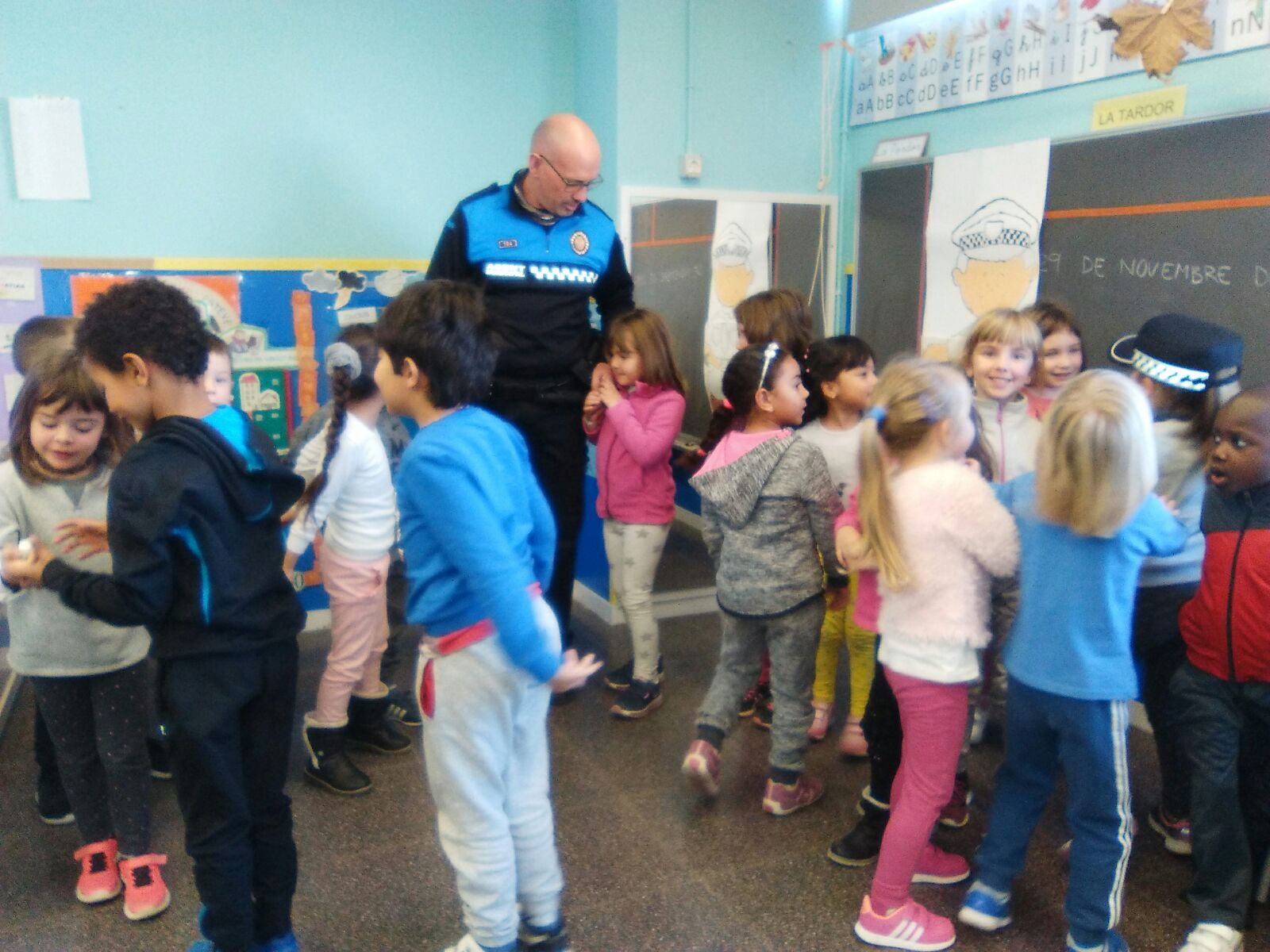El vigilant va descriure una classe molt treballadora, ja que amb la seva ajuda, anaven posant i traient l’equipament a un misteriós personatge dibuixat a la paret, segons les propostes de la professora.