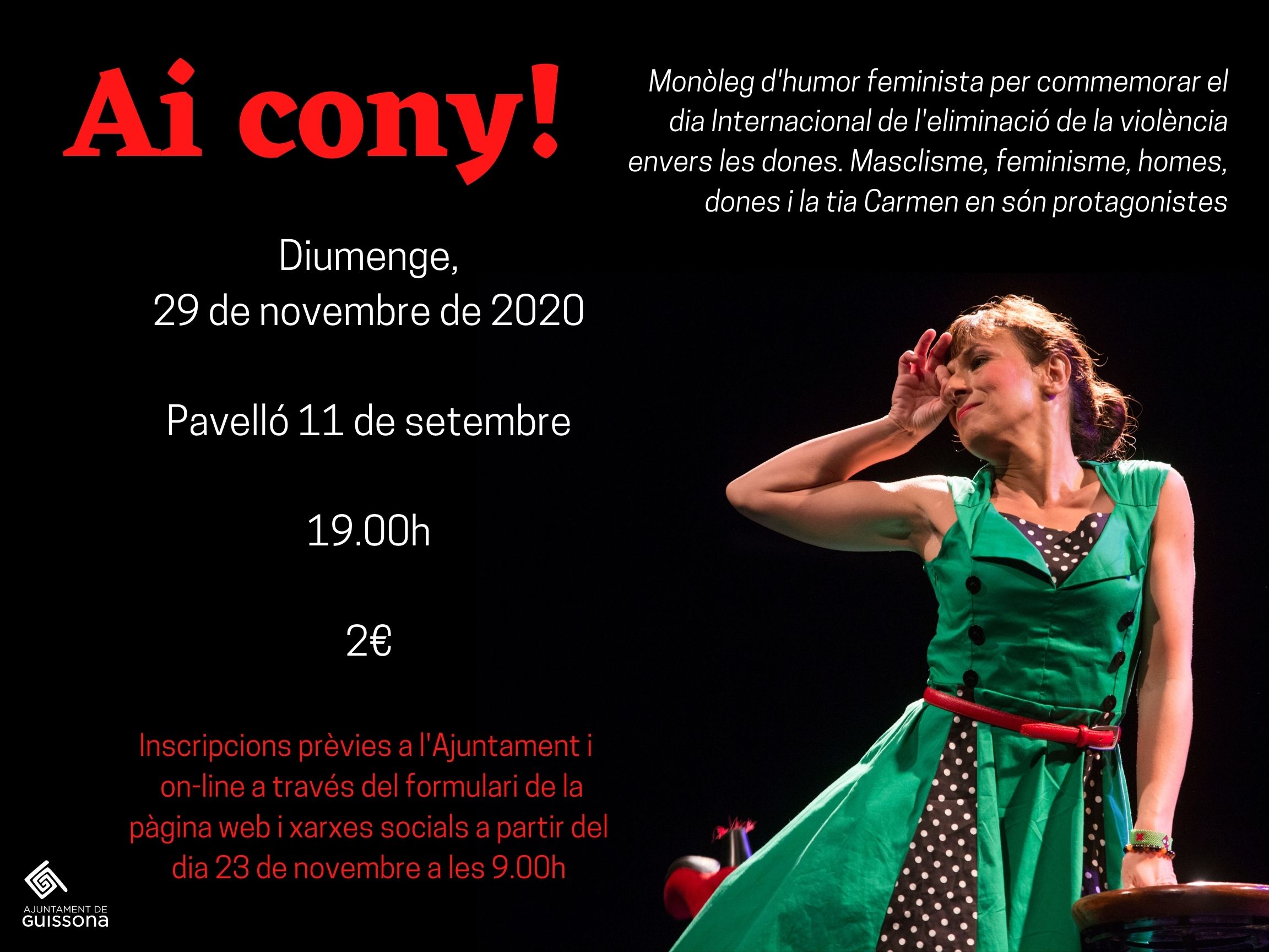 A més a més, el proper diumenge, l’Ajuntament ha organitzat l'espectacle AI CONY!!, de Teatre de Maleta. Un monòleg d'amor, humor i ovaris que pretén donar veu a les emocions, inquietuds i vivències de les dones del segle XXI, i alhora mostrar la mirada que tenim les dones de la societat que ens envolta: els nostres anhels, les nostres lluites, la família, el sexe, la professió, l’orientació sexual, la vocació, la maternitat, l’amor, la parella… des de la mirada de la dona europeu-centrista, des del privilegi d’haver nascut al món occidental, el primer món.