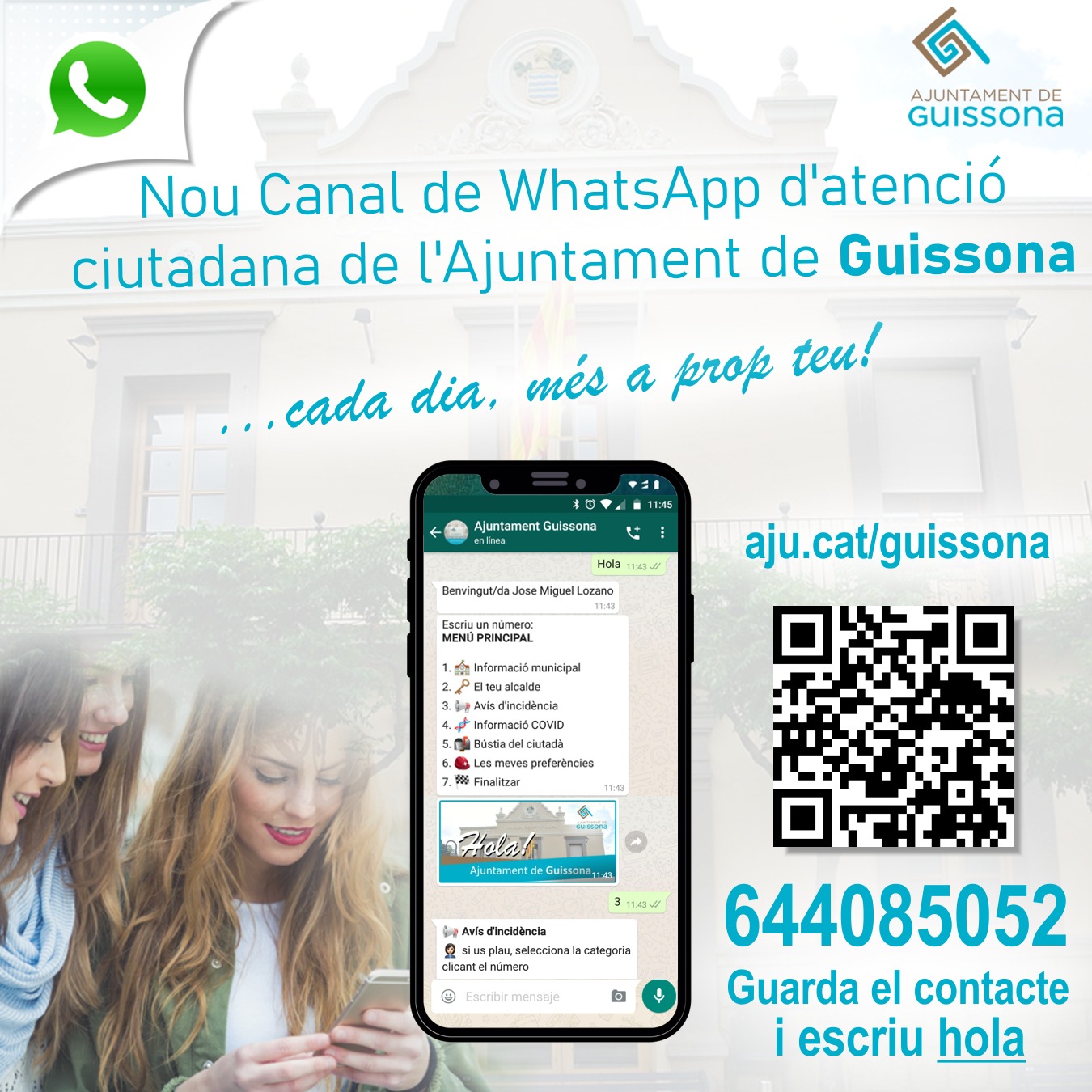Els Guissonencs i Guissonenques tenen una nova manera de relacionar-se amb l'Ajuntament, de forma ràpida i directa. L'equip de govern de l'Ajuntament de Guissona segueix fomentant els entorns de transparència i comunicació amb els seus veïns i veïnes, i aposta per un nou canal municipal que permet la comunicació bidireccional a través de WhatsApp. Aquesta nova proposta ja està a l'abast de tots els veïns i veïnes que disposin de mòbil amb aquesta aplicació i amb accés a Internet.