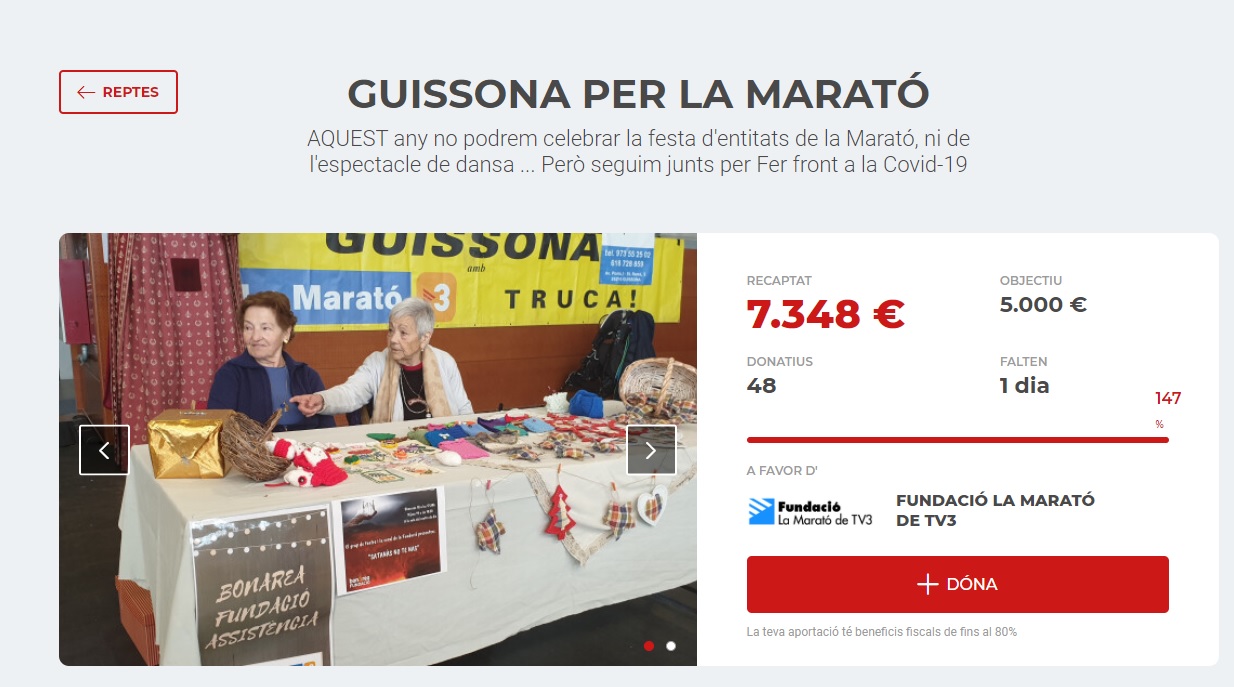 En un any complicat en el que les mesures preventives contra la Covid-19 no ens han permès fer la festa d’entitats per la Marató de TV3, ni altres actes multitudinaris com l’espectacle Solidaritat en Dansa, Guissona s’ha reinventat, posant cada centre educatiu, cada entitat i associació i cada guissonenc i guissonenca el seu granet de sorra perquè el municipi pogués aconseguir el repte de recaptació de 5000€ que s’havia plantejat per la Marató de TV3 i superar-lo en escreix.