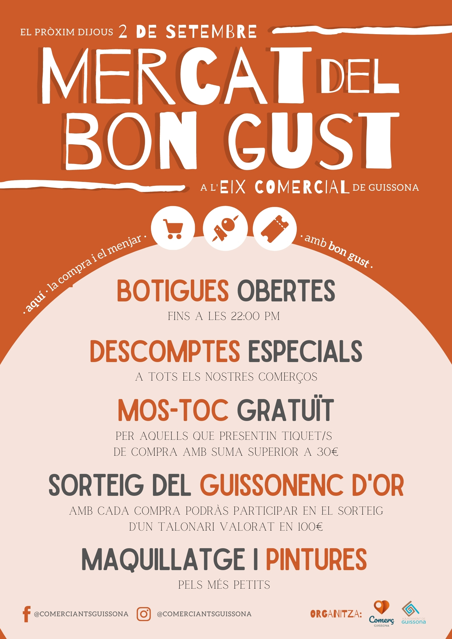 Les botigues estaran obertes fins a les deu de la nit i pels carrers hi haurà maquillatge infantil pels infants. A més a més per a aquelles persones que presentin tiquets de compra amb una suma superior a 30€ tindran un Mos-toc gratuït. També es durà a terme un sorteig que porta per lema “El Guissonenc d’or”, que consisteix en el sorteig d’un talonari valorat en 100€ a gastar a les botigues de Guissona.