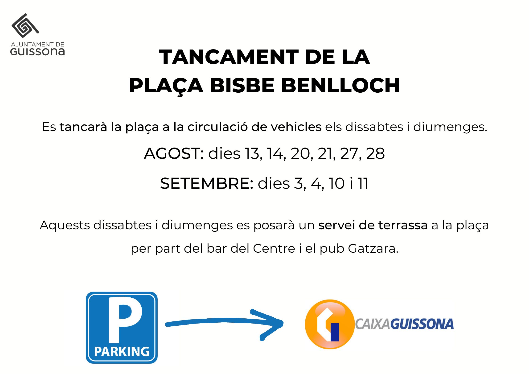 Per tal de poder donar resposta a la necessitat de zones d’aparcament per a la compra a l’eix comercial, hem establert un acord amb Caixa Guissona i bonÀrea per poder disposar de les seves places d’aparcament aquests dies indicats, concretament de les 8.00h. a les 21.00h. Un acord que agraïm moltíssim.