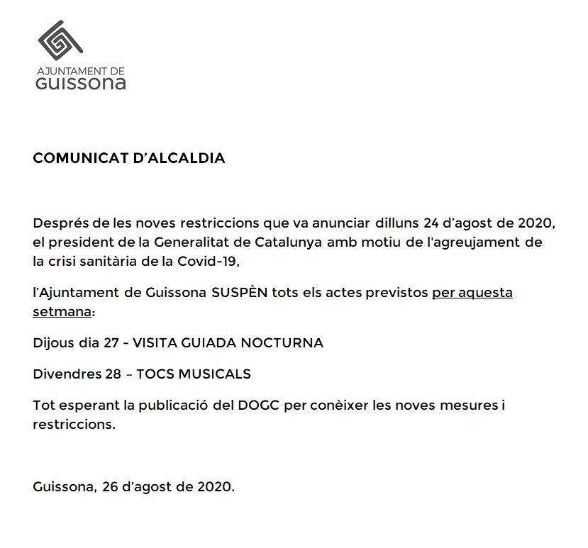 Després de les noves restriccions que va anunciar dilluns 24 d’agost de 2020, el president de la Generalitat de Catalunya amb motiu de l'agreujament de la crisi sanitària de la Covid-19, l’Ajuntament de Guissona SUSPÈN tots els actes previstos per aquesta setmana