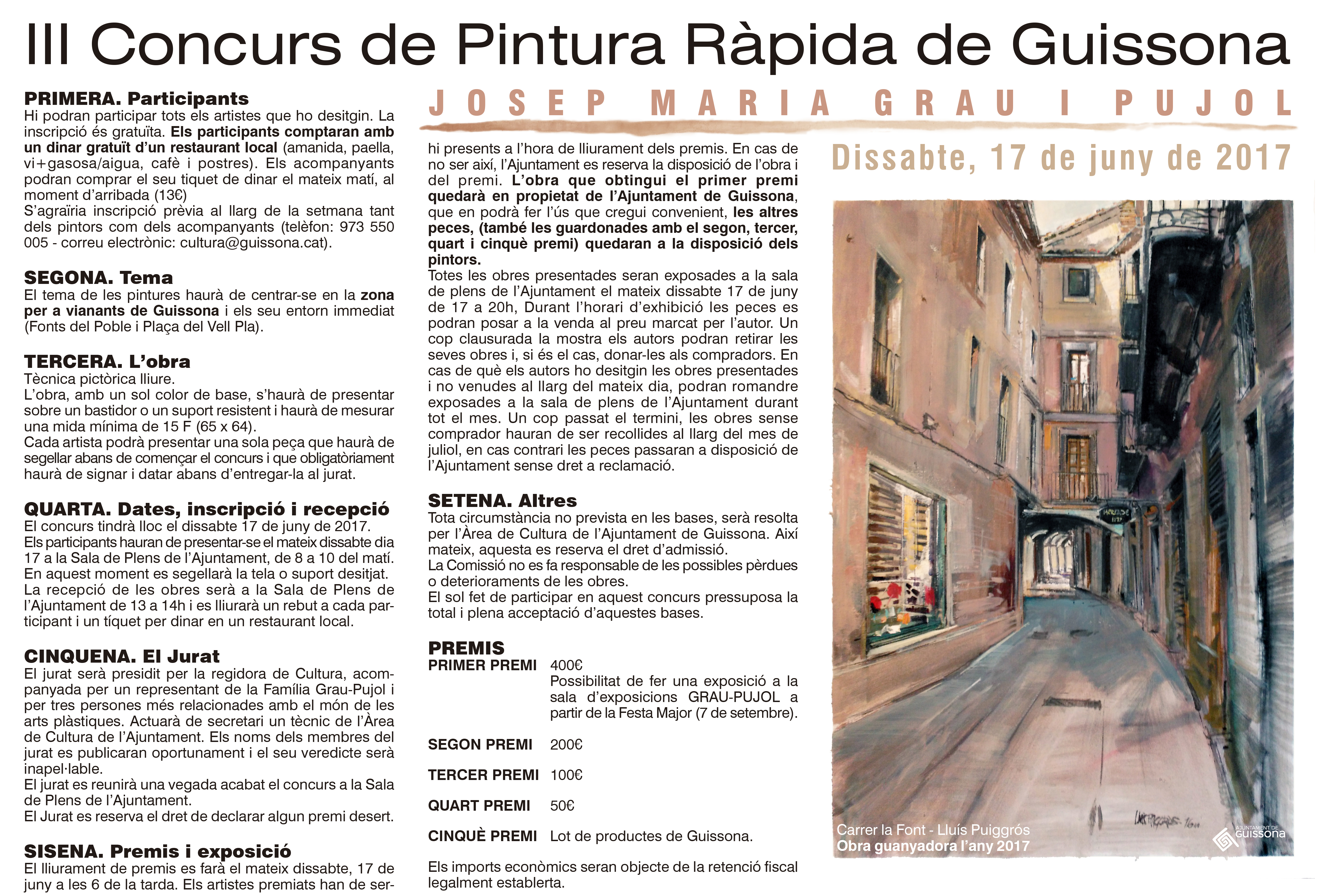 L’Ajuntament de Guissona, per 3r any consecutiu presenta les bases del Concurs de Pintura Ràpida Josep Maria Grau i Pujol. Enguany l’activitat es durà a terme de forma paral·lela a la confecció de les catifes de Corpus per part de les entitats locals. A més a més, en aquesta edició els participants gaudiran d’un dinar de germanor entre el moment d’entrega de les obres i el lliurament de premis. Com en les altres ocasions el primer premi, valorat per 400€ quedarà a disposició de l’Ajuntament. La resta d’obres es podran deixar en dipòsit a l’Ajuntament per a la seva venda i exposició durant tot el mes de juny.