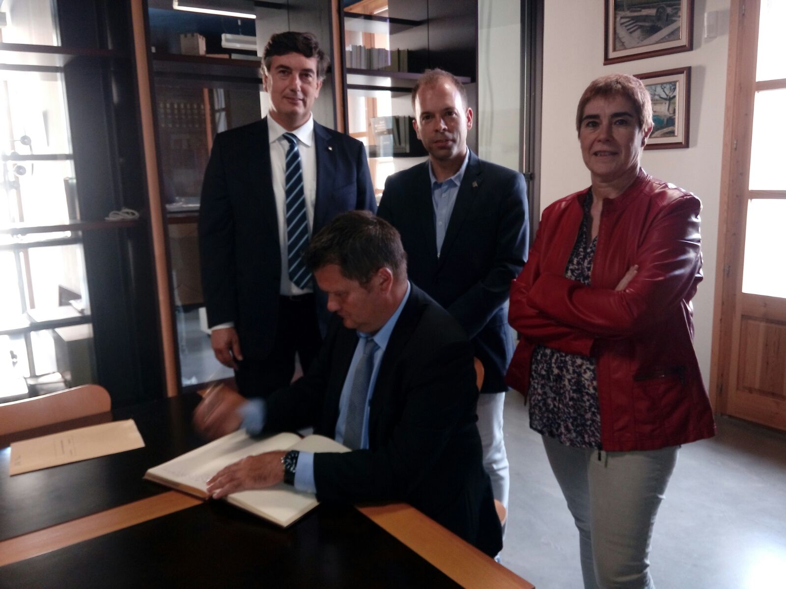 El director de serveis Territorials d’Ensenyament a Lleida, Miquel Àngel Cullerés ha fet una visita aquest mateix dimarts l’Ajuntament de Guissona. Ha vingut acompanyat d’Antoni Massegú, director general de centres públics, que ha signat el llibre d’honor.