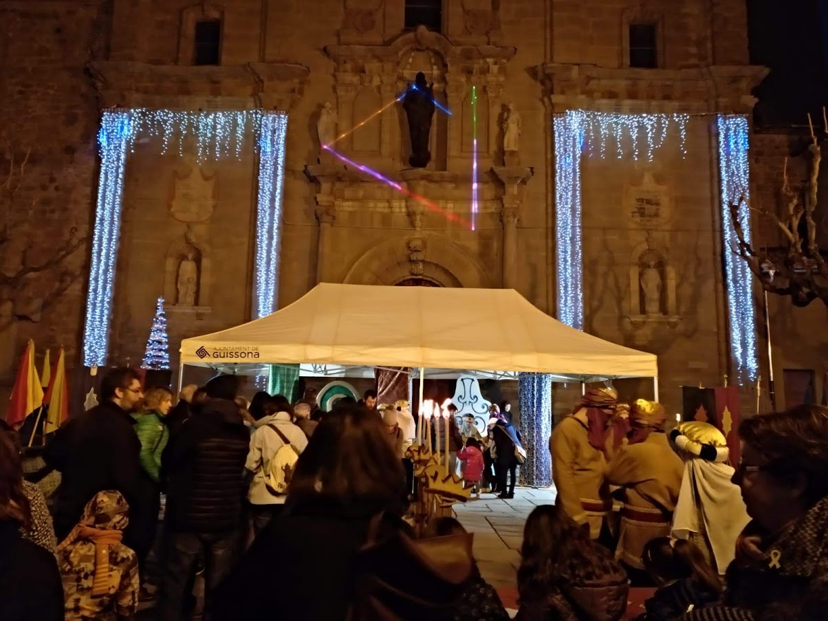 Després d'un llarg viatge, el patge Karim, la patgessa Xumet i els seus ajudants, van arribar aquest dissabte a la tarda a Guissona per recollir les cartes dels més petits i lliurar-les als Reis Mags d'Orient. Després d'un recorregut pels carrers de la vila, van fer parada al campament reial de la Plaça Major, on malgrat el fred i la boira, més d'un centenar de nens i nenes els estaven esperant. Després d'una llarga cua, arribava el moment més esperat, lliurar la carta amb tots els desitjos als missatgers dels Reis.