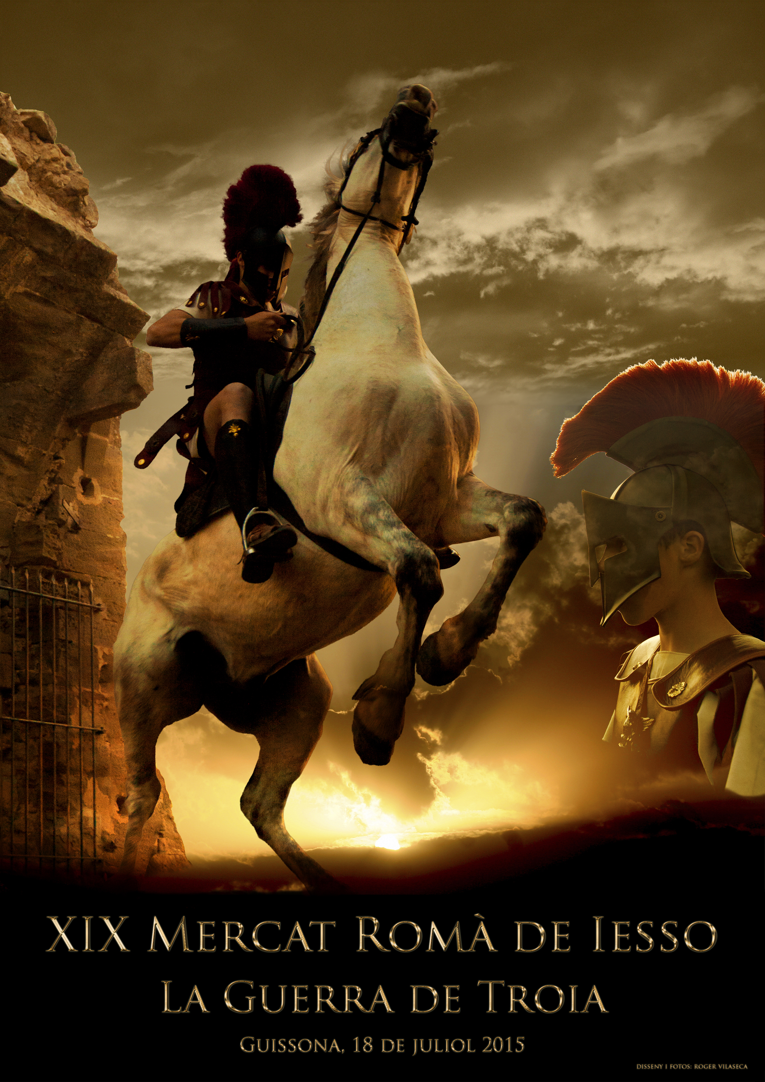 El cartell parteix d’una fotografia que es va fer a l’entorn de l’Obra de Fluvià a la sortida del sol, amb un soldat vestit a mode grec i a cavall, donant força a l’eix del Mercat Romà 2015, la guerra de Troia. Així doncs, el cartell, de caire més èpic, encaixa perfectament amb l'eix conductor d'enguany: LA GUERRA DE TROIA.