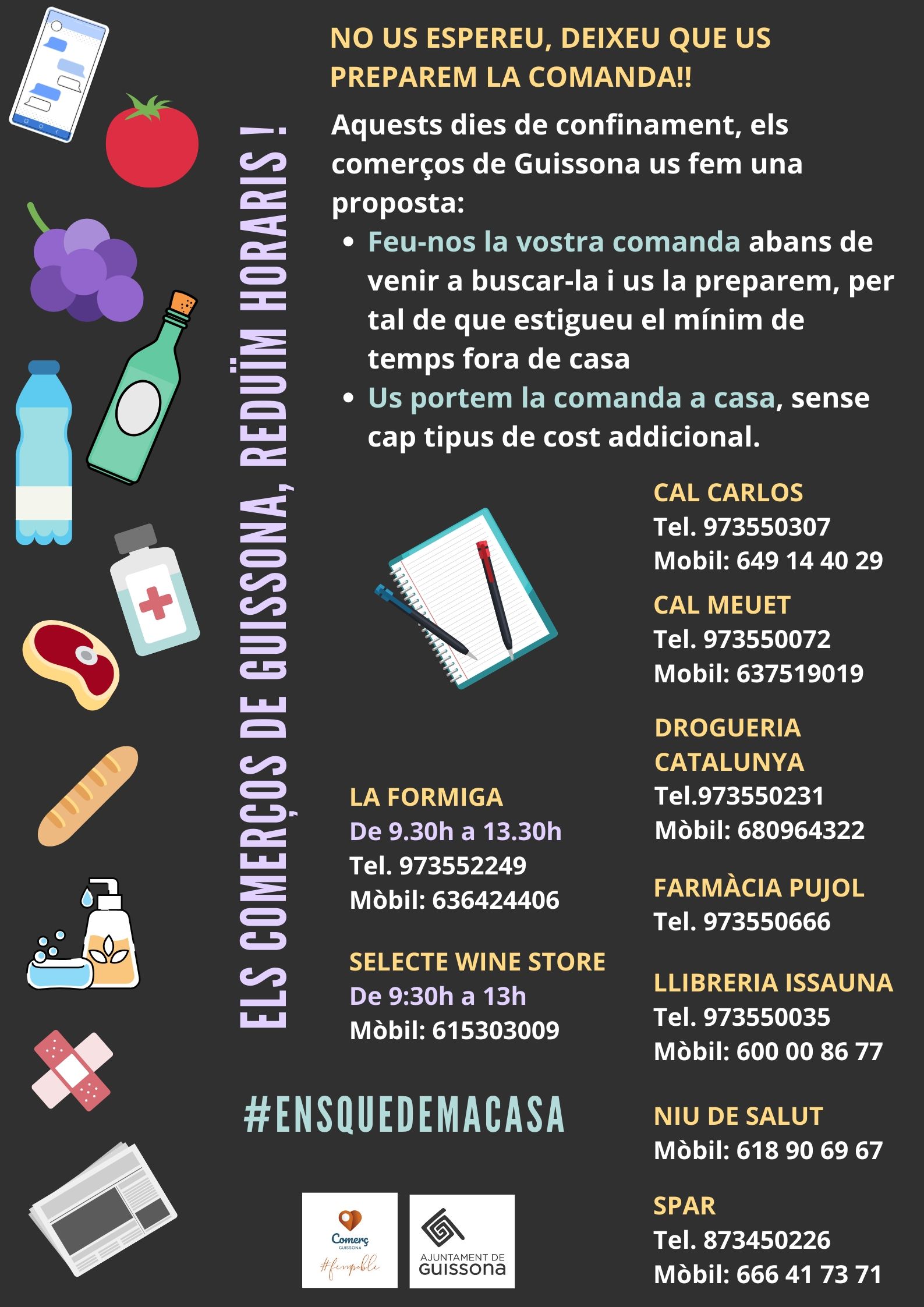 La regidoria de comerç de l’Ajuntament de Guissona, encapçalada per Ramon Sala, ha sol·licitat als comerciants que ofereixen SERVEIS BÀSICS (alimentació, farmàcies, forns de pa, drogueries, …) que redueixin els seus horaris amb la mesura que sigui possible i com a alternativa que ofereixin servei a domicili, amb l’objectiu d’evitar al màxim el trànsit de la població pels carrers durant el període de confinament a causa del Covid-19.