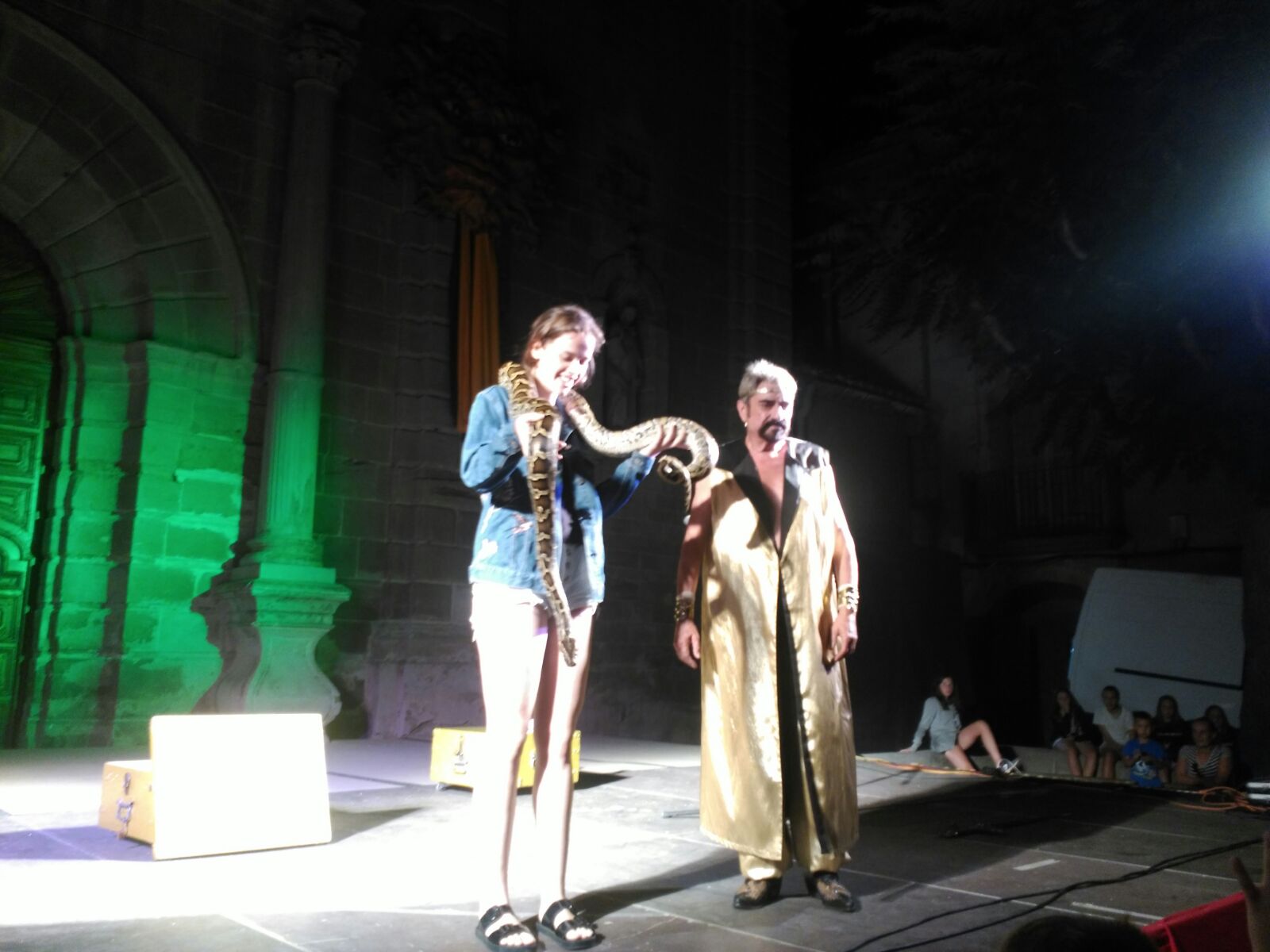 En varies ocasions, diferents voluntaris es van aixecar de la seva cadira per pujar a l’escenari a posar-se una de les seves serps al coll. Dins el seu habitacle, tranquil·les però sense perdre de vista la visita, les seves serps, semblaven gaudir ensenyant la seva finíssima llengua a tothom.
