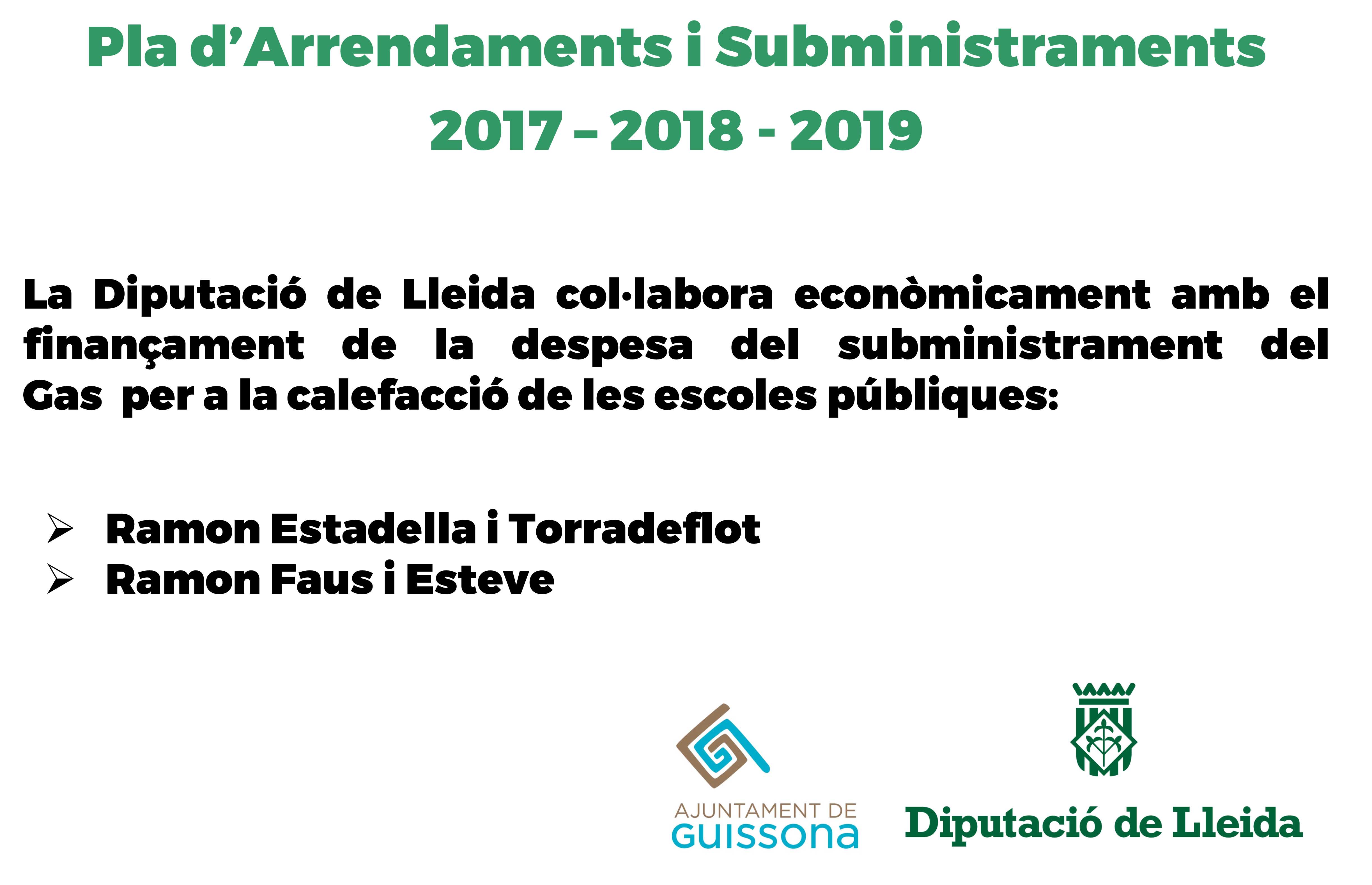 Dins de la línia de subvencions SUBMINISTRAMENTS I ARRENDAMENTS 2017, 2018 I 2019 de la Diputació de Lleida. L'Ajuntament de Guissona ha rebut una subvenció per l'actuació de despeses de subministrament de gas a les escoles públiques.