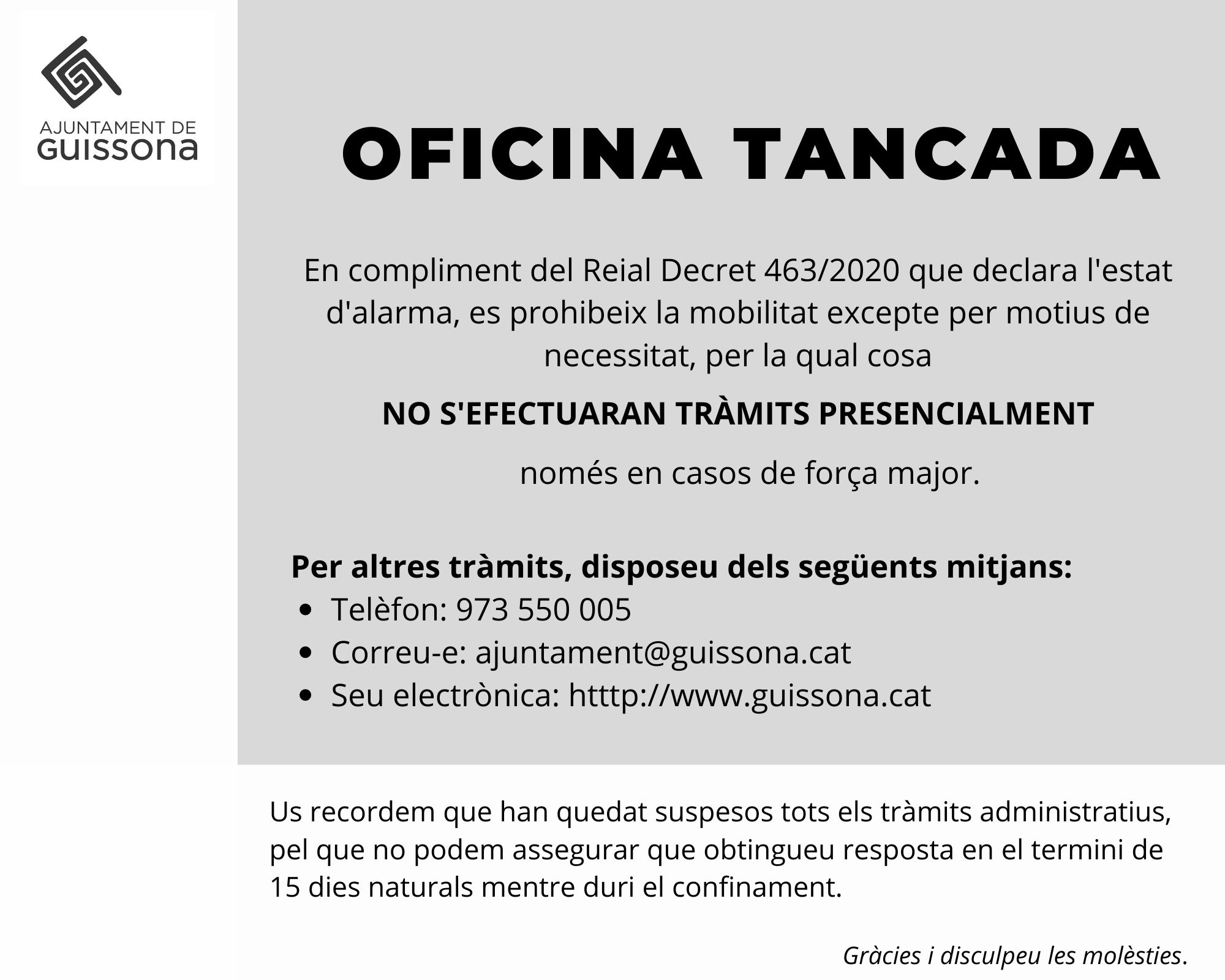 En compliment del Reial Decret 463/2020 que declara l'estat d'alarma, es prohibeix la mobilitat excepte per motius de necessitat, per la qual cosa a les oficines de l'Ajuntament de Guissona NO S'EFECTUARAN TRÀMITS PRESENCIALMENT, excepte en casos de força major.