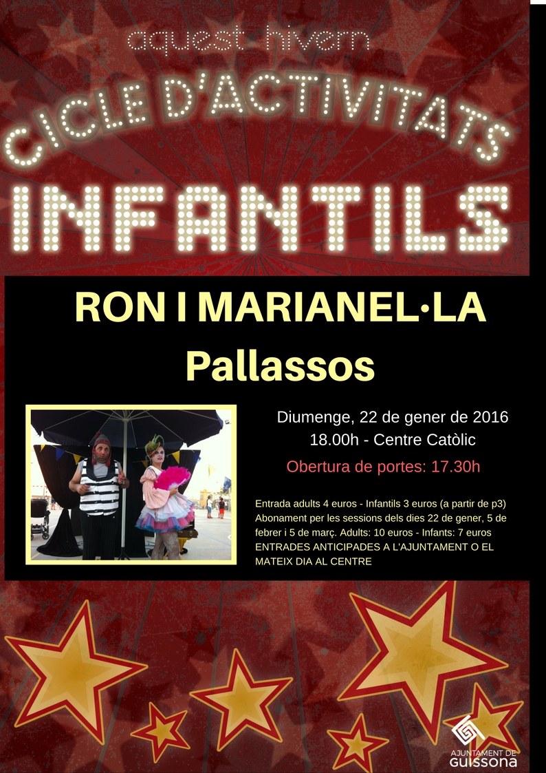 Enguany, des de la regidoria de cultura de l'Ajuntament es plantegen tres propostes ben diferenciades, un diumenge al mes, durant els mesos de gener, febrer i març. Els més petits de Guissona podran gaudir d'espectacles de pallassos, titelles i circ.