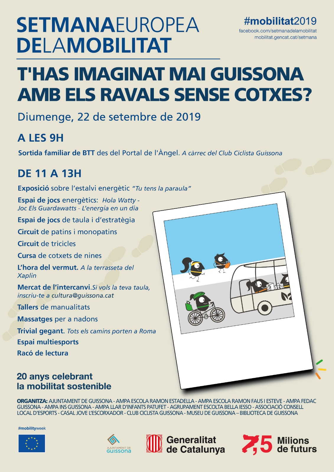 Aquesta proposta serà possible gràcies a la col·laboració de totes les AMPEs i també del CAU, del Consell Local d’Esports, del Pub Chaplin, del Club Ciclista Guissona, de la Biblioteca, del Museu, del Casal Jove l’Escorxador i dels voluntaris d’aquestes entitats que de forma desinteressada donen suport en aquest acte organitzat en el marc de la setmana de la mobilitat sostenible.