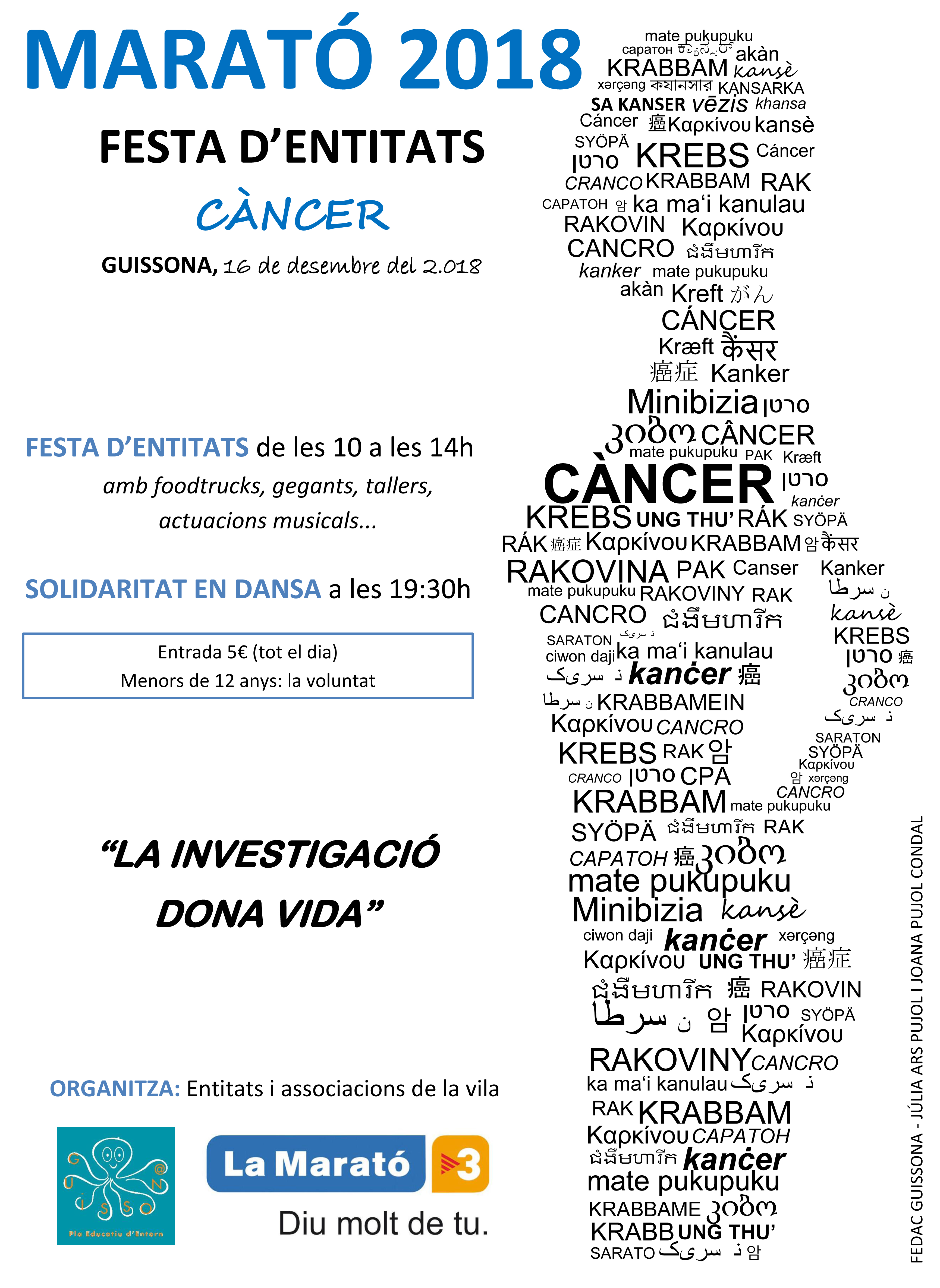 I l’activitat segueix a la tarda, amb l’espectacle SOLIDARITAT EN DANSA, de l’Escola de Dansa Montse Esteve, un espectacle que es porta a terme a Guissona des dels primers anys de la Marató i que la gran afluència de públic i la il·lusió dels dansaires en preparar-lo fa que es converteixi en la proposta més esperada any rere any.