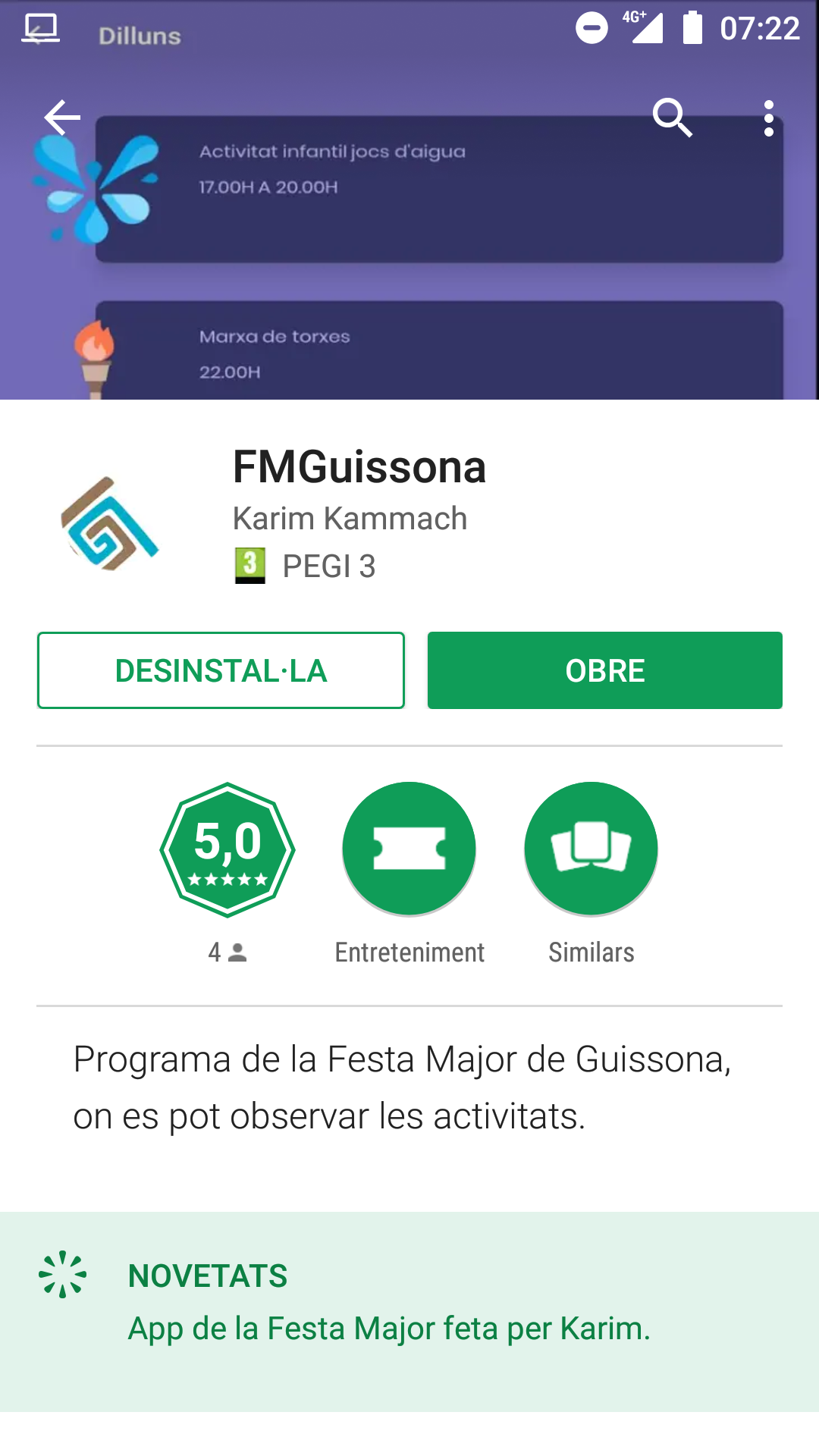 El veí de Guissona Karim Kammach ha creat desisteressadament l'app de Guissona amb tota la programació de la Festa Major 2018. Aquesta es pot descarregar amb el nom de "FMGuissona".