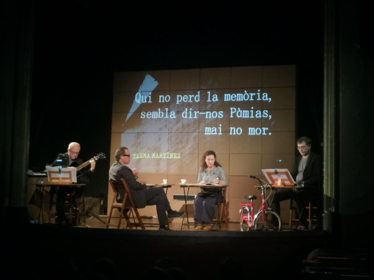 L’acte, que va tenir lloc el dissabte 28 de setembre en un entorn excepcional i molt adient per a aquesta efemèride, com és el Teatre de Ca l’Eril de Guissona, va comptar amb l’excel·lent representació de l’obra “He besat la terra humida”, de la companyia Cassigalls. L’espectacle, un recital audiovisual inspirat en el poeta Jordi Pàmias i la seva poesia, va fer gaudir i emocionar el públic assistent, amb una sessió en la que es combinava imatge, so, música en directe i escenografia teatralitzada, que conjuntament amb la lectura de poemes del poeta protagonista, aconseguiren fer una tasca molt acurada d’aproximació a l’essència de l’obra de Jordi Pàmias, a les temàtiques presents en la seva obra, la vida, la mort i el destí dels homes. D’altra banda, mitjançant el recital de poemes musicats, l’obra posa en relleu quins han estat els referents de la poesia catalana cabdals per a l’obra de Pàmias, com són Verdaguer o Espriu. L’obra també ha visualitzat l’estima del poeta pel paisatge i el patrimoni, la gran sensibilitat que l’escriptor guissonenc ha fet palesa a la seva obra, així com també el seu compromís i trajectòria reivindicativa en l’àmbit social, aspecte que ha destacat sempre al llarg la seva obra poètica.