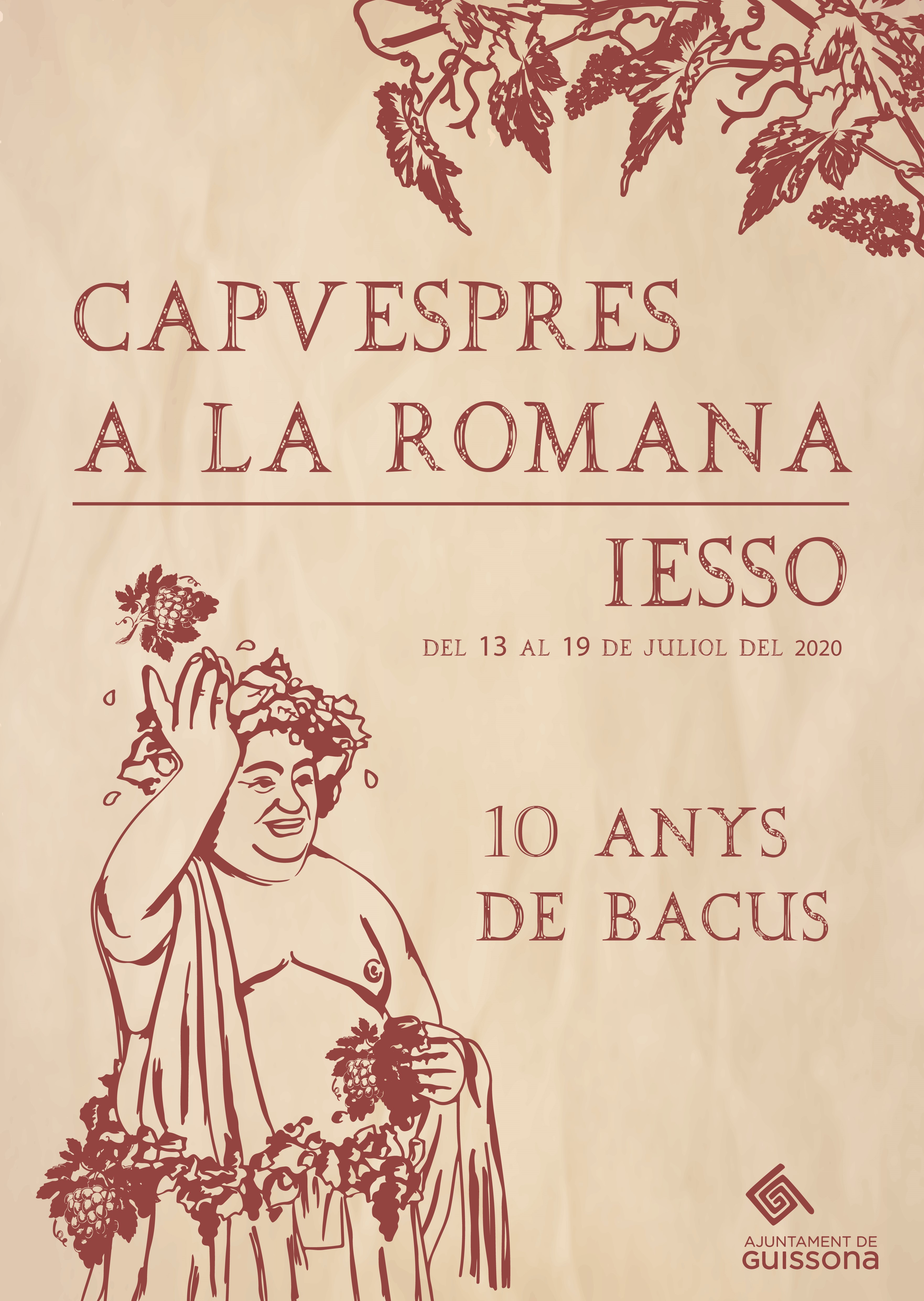 Guissona presenta el cartell dels CAPVESPRES a la ROMANA de Iesso, que tindrà BACUS com a eix conductor de diferents activitats, atès que enguany aquest gegant de Guissona compleix 10 anys. En aquest sentit, i com es va anunciar fa uns dies a través d’un comunicat, s’ha anul·lat el Mercat Romà a causa de la pandèmia del coronavirus Covid-19, que esdevenia cada any els tercer dissabte de juliol. El que si es manté són els Capvespres a la Romana, amb propostes culturals per a cada vespre durant la setmana del 13 al 19 de juliol. Enguany, l’Ajuntament en col·laboració amb el Museu de Guissona, ha apostat per artistes de proximitat, com El Petit de Cal Eril, la Jove Companyia de Dansa Montse Esteve o Glòria i Maria Ribera, entre altres.
