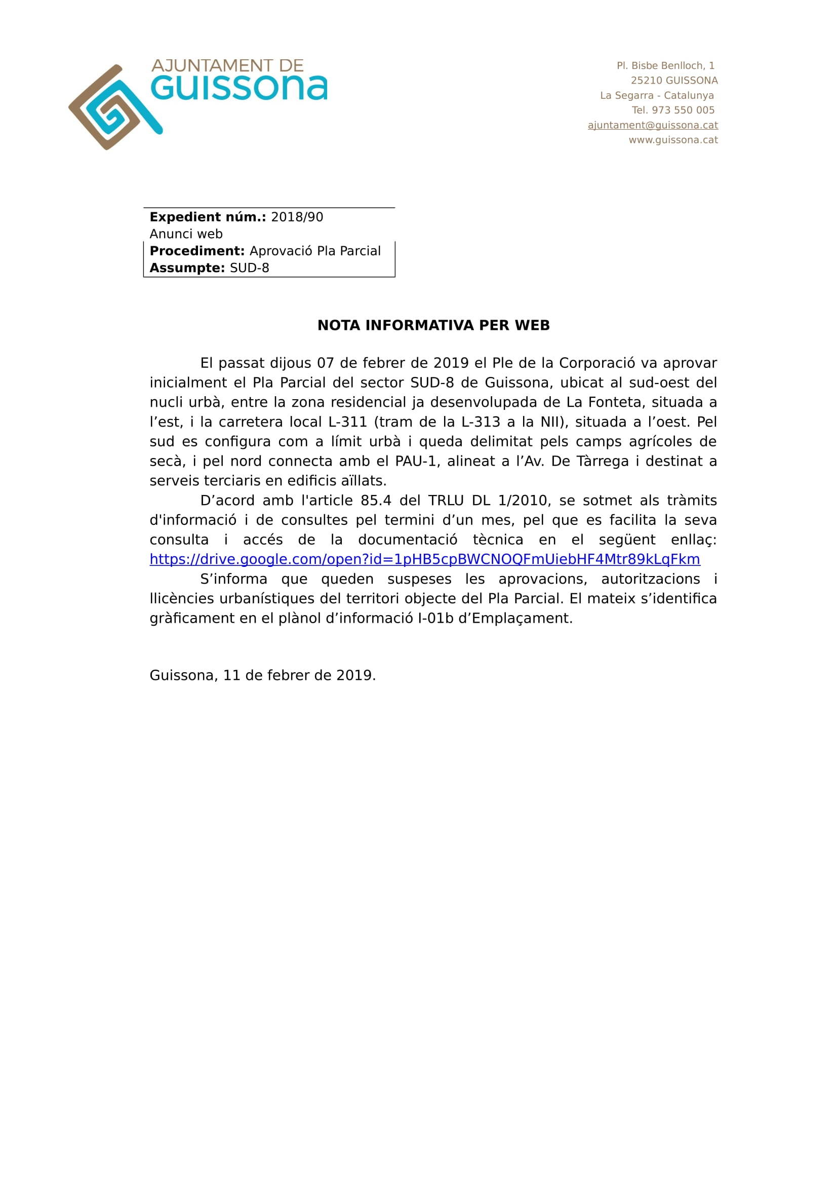 El passat dijous 07 de febrer de 2019 el Ple de la Corporació va aprovar inicialment el Pla Parcial del sector SUD-8 de Guissona, ubicat al sud-oest del nucli urbà, entre la zona residencial ja desenvolupada de La Fonteta, situada a l’est, i la carretera local L-311 (tram de la L-313 a la NII), situada a l’oest. Pel sud es configura com a límit urbà i queda delimitat pels camps agrícoles de secà, i pel nord connecta amb el PAU-1, alineat a l’Av. De Tàrrega i destinat a serveis terciaris en edificis aïllats.