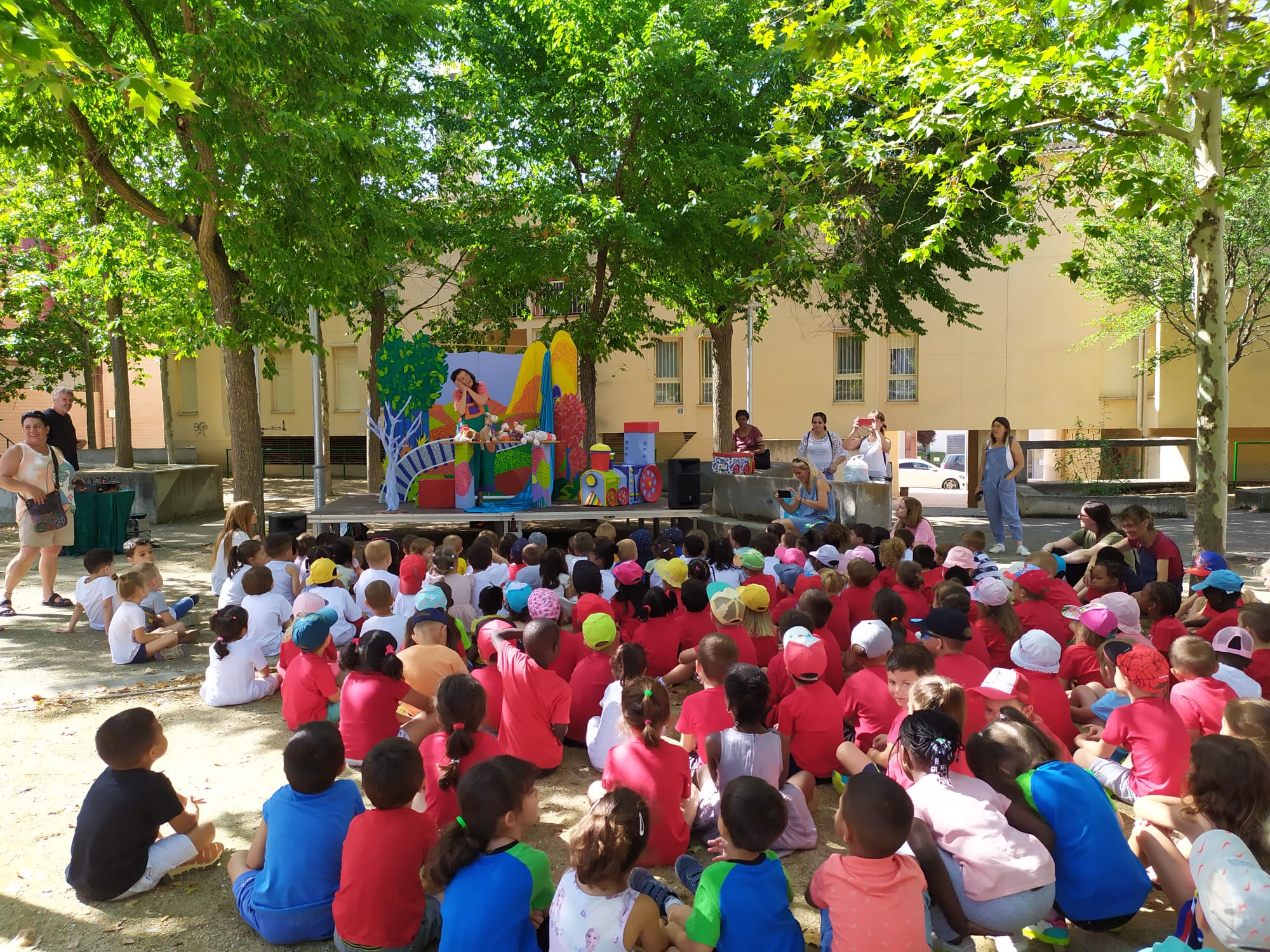 L'alumnat de P2 a P4 s'han concentrat a la plaça de la Segarra, un indret ombradiu, on han gaudit d'un espectacle adaptat a la seva franja d'edat , amb la proposta Tu-tuut! de la companyia Fes-t'ho com vulguis, que els ha portat un tren amb vagons plens de contes, al que han pujat i han gaudit d'històries tendres i divertides.